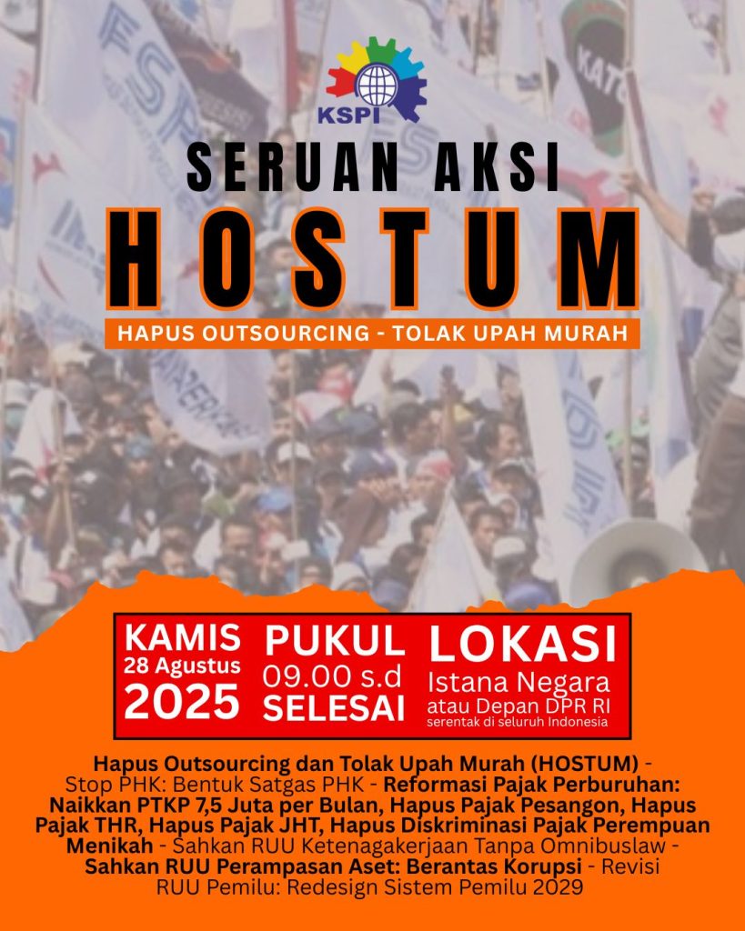Jakarta, Agustus 2025 — Konfederasi Serikat Pekerja Indonesia (KSPI) mengumumkan rencana Aksi Nasional yang akan digelar pada 28 Agustus 2025. Tuntutan utama aksi ini adalah penghapusan sistem outsourcing dan penolakan terhadap praktik upah murah yang dinilai merugikan kaum pekerja.